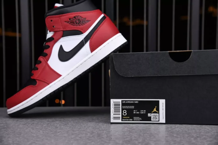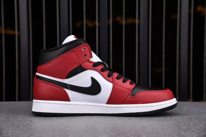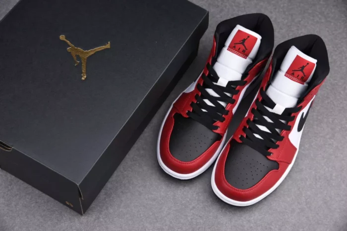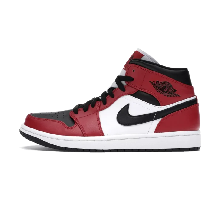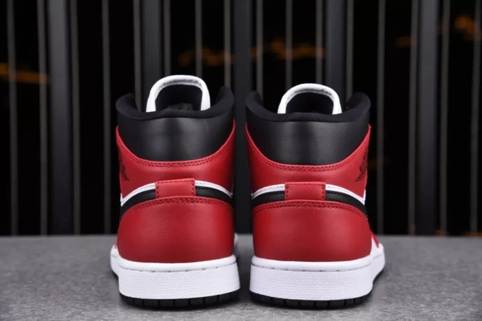 The Air Jordan 1 Mid ‘Chicago Black Toe’ draws inspiration from the sneaker’s 1985 roots. The distinctive color blocking is reminiscent of the OG ‘Chicago’ colorway, applied to a mid-top silhouette and revised with a black finish on the perforated toe box. Jumpman branding adorns the woven tag stitched onto the padded white nylon tongue, while a classic Jordan Wings logo is stamped in black on the lateral collar flap.