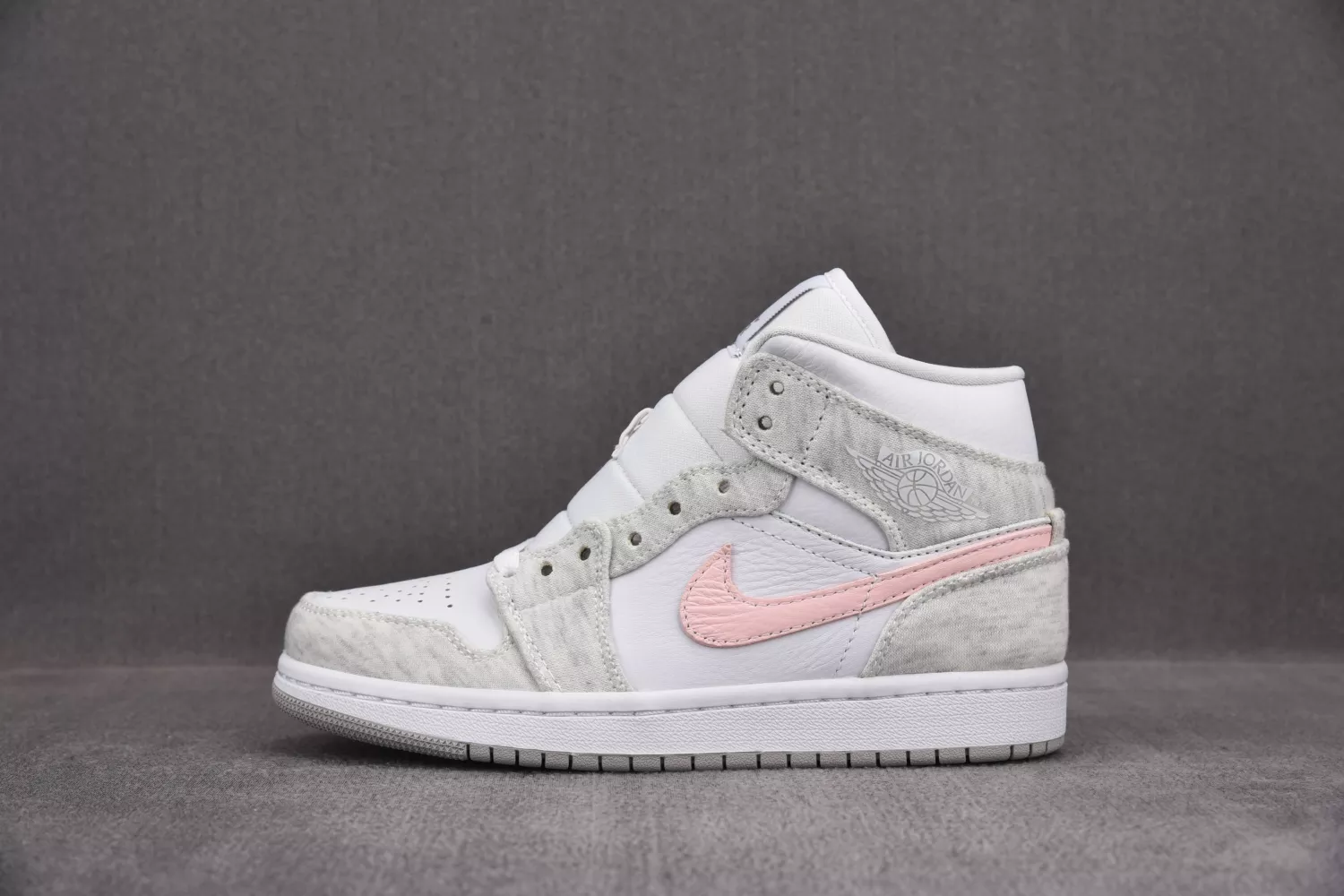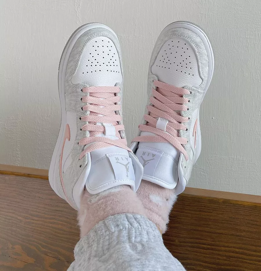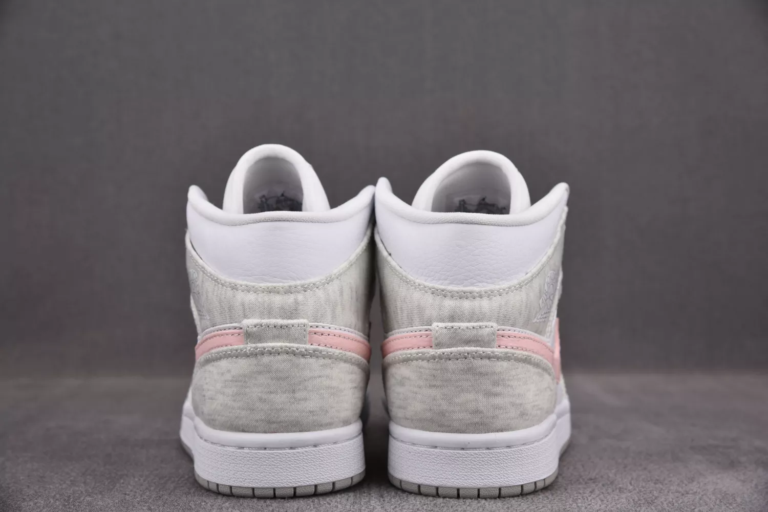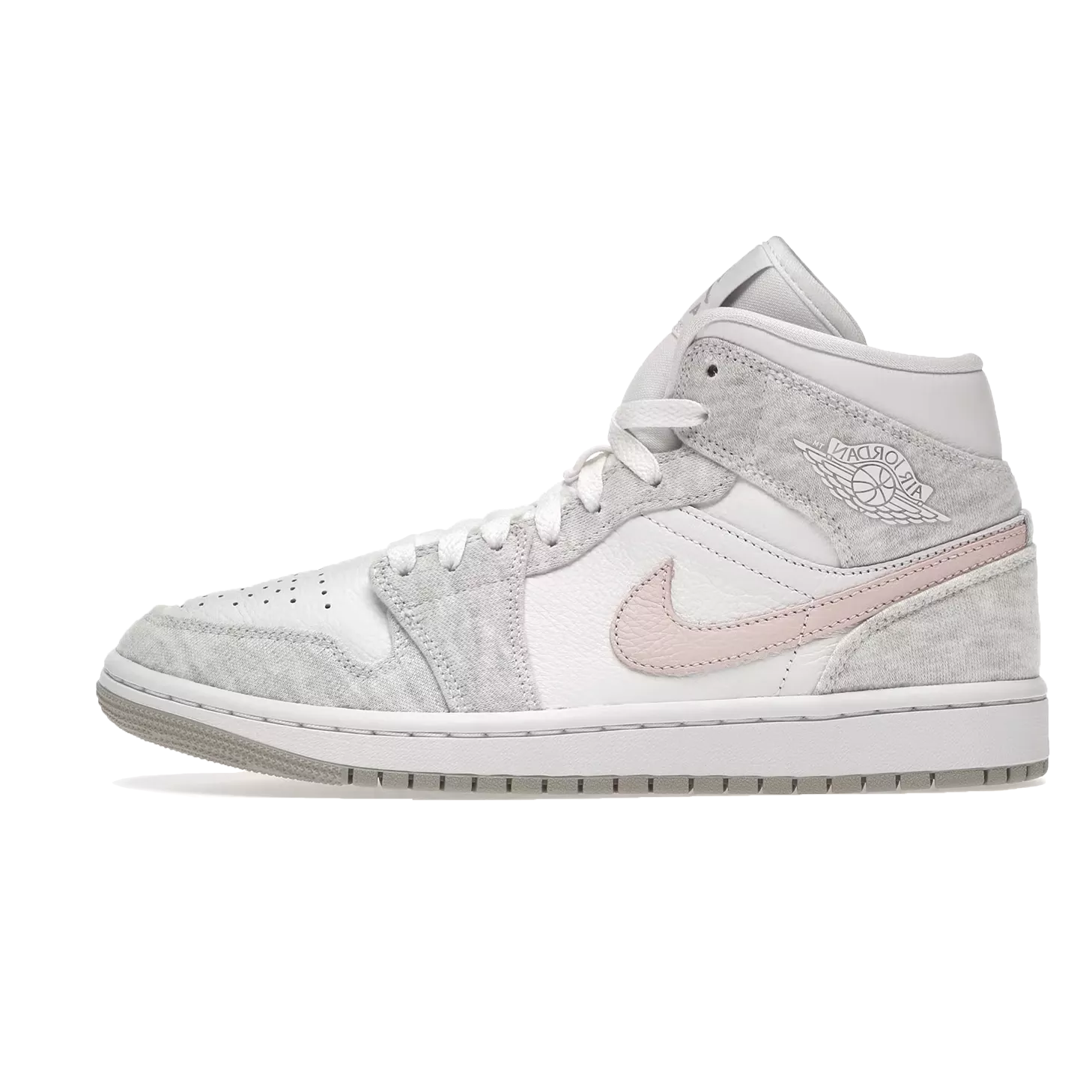 Anchored with a white leather base, the pair then slips into something a little more comfortable — terry fleece fabrics in traditional sweatsuit marl grey. With whites and greys elsewhere, the pair remains fairly subdued, save the striking-yet-soft midfoot Swoosh in tumbled pink leather. All-white tongues, liners, laces, and midsoles come through before the pair is finished off with a grey-gum outsole sitting beneath.