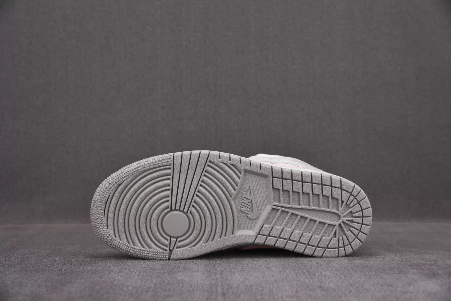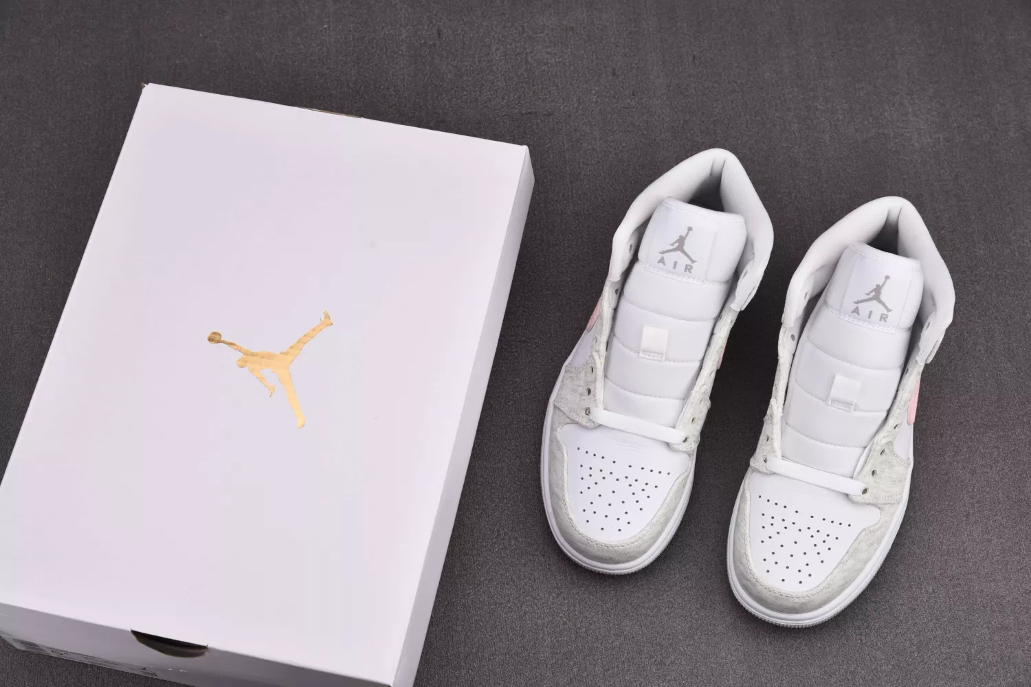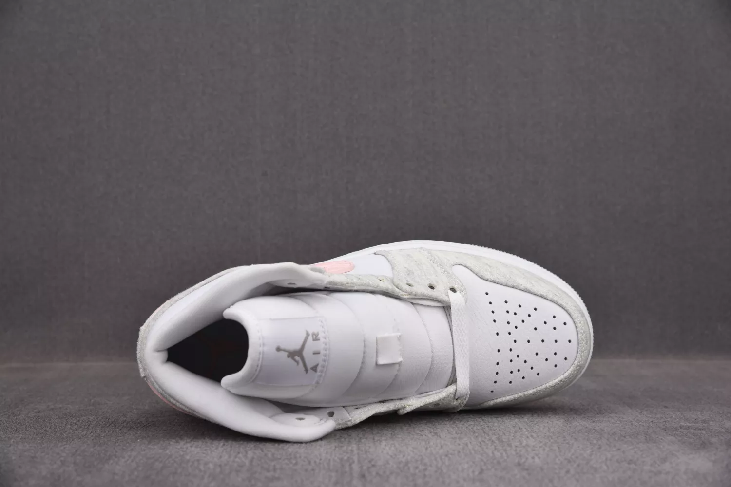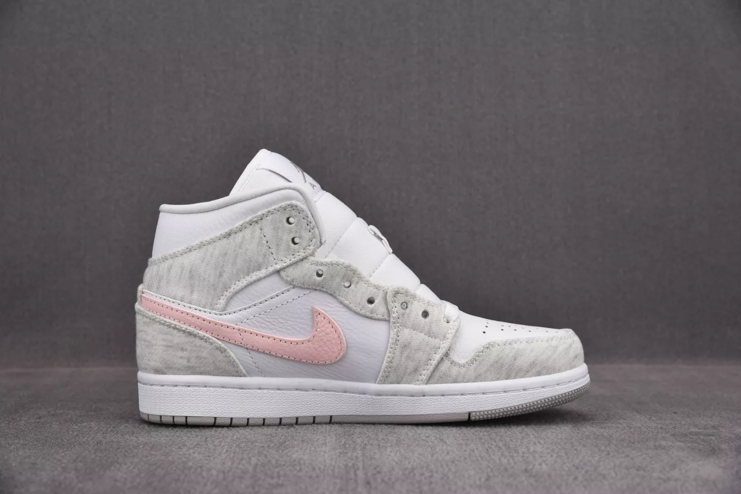 Anchored with a white leather base, the pair then slips into something a little more comfortable — terry fleece fabrics in traditional sweatsuit marl grey. With whites and greys elsewhere, the pair remains fairly subdued, save the striking-yet-soft midfoot Swoosh in tumbled pink leather. All-white tongues, liners, laces, and midsoles come through before the pair is finished off with a grey-gum outsole sitting beneath.
