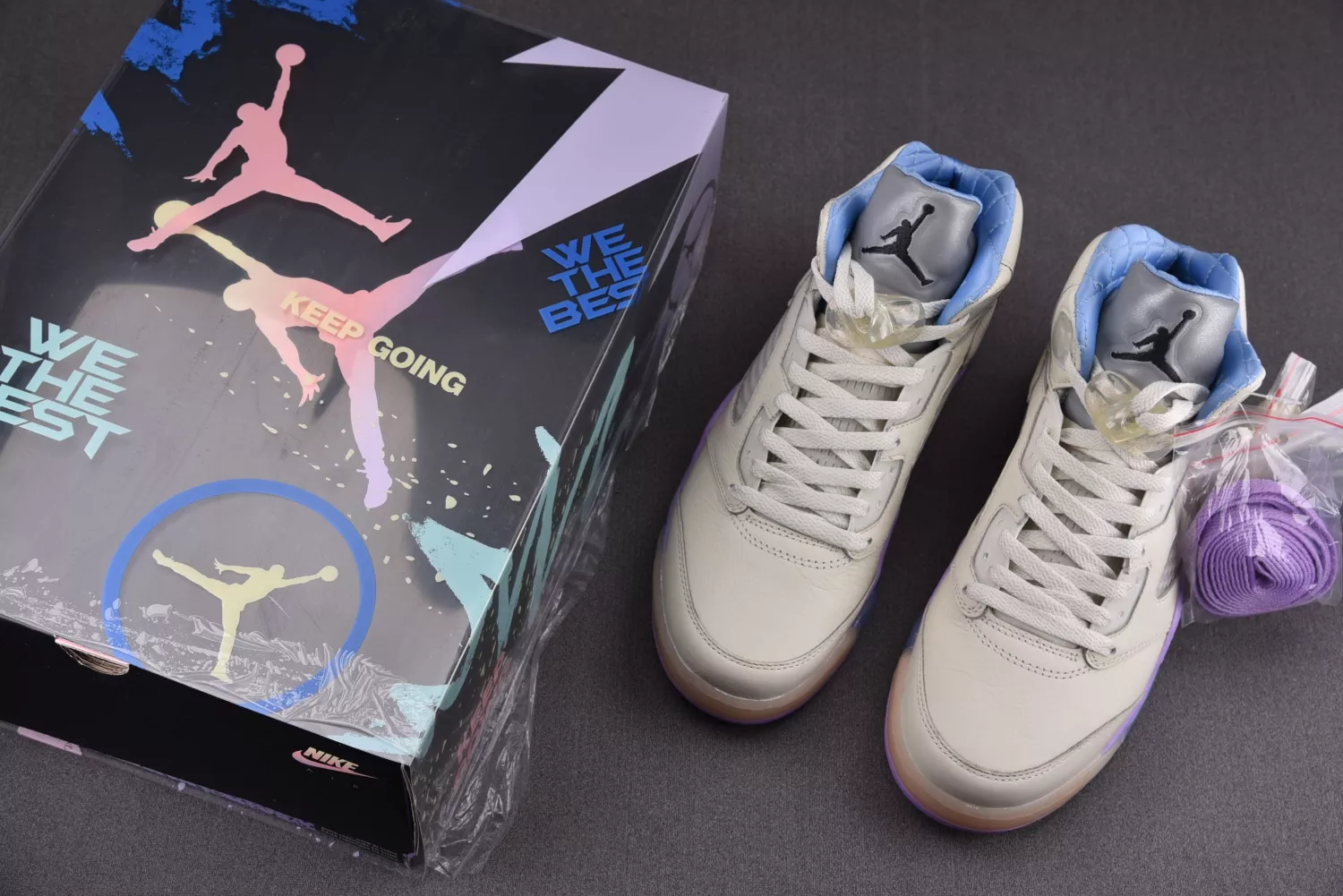 This series chooses eye-catching soft tones and injects high-quality leather uppers, continuing the classic silhouette design of Air Jordan 5. The embroidered We The Best and Jordan Brand Logos can be seen on the heel for left and right protection, and there are different color matching. unique identity. “Sail” covers the main body with light beige, supplemented by light purple, blue and silver for details; “Crimson Bliss” uses peach-orange as the theme color matching, choosing cream and silver blue as matching.