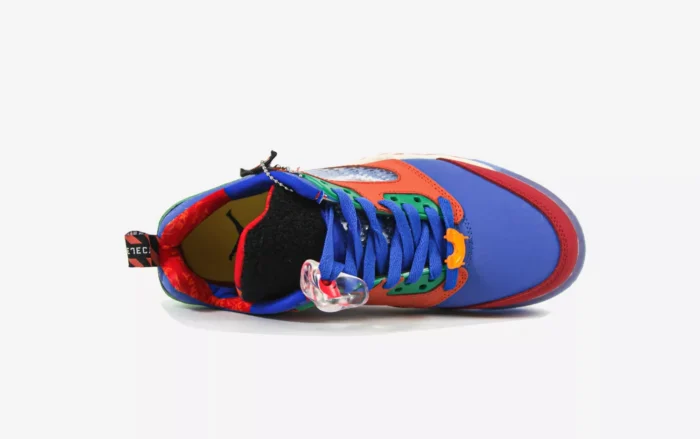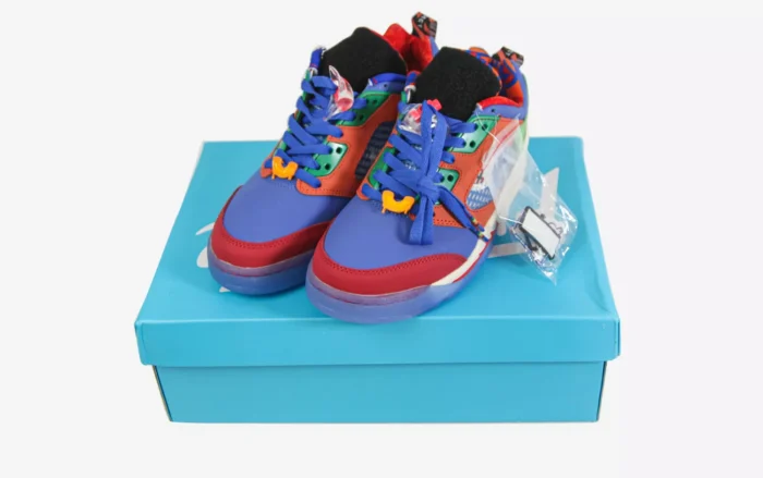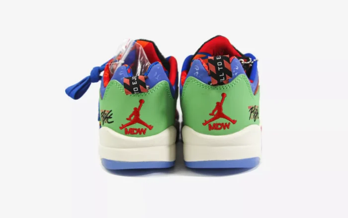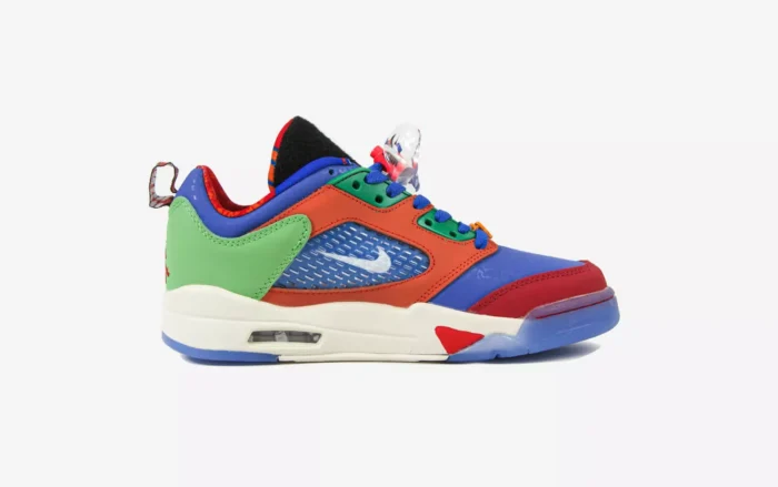 The 2022 Doernbecher Freestyle collection has officially been unveiled and includes a great lineup of sneakers. Michael Wilson’s Air Jordan 5 Low is featured in this year’s collection, using his love for Mac and Cheese, airplanes, and sharks as his inspiration. The sneaker uses a suede upper in an array of colors with the base of the upper seen in royal blue with macaroni printed throughout on the toebox and near the ankle. An eye can be seen underneath the translucent netting on the quarter panel with “TAKE Flight” debossed on the heel. Jumpman branding is seen on the heel with Michael’s initials stitched underneath with the tongue not featuring the symbol on the black chenille tongue. A macaroni lace dubrae is featured with a white midsole and red accenting and a translucent outsole to finish off the sneaker.