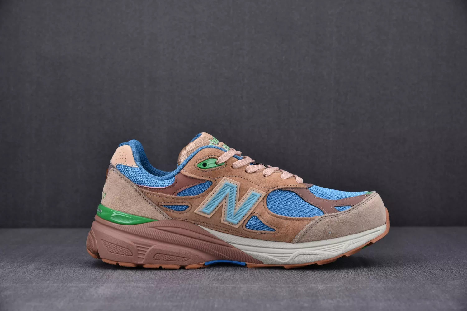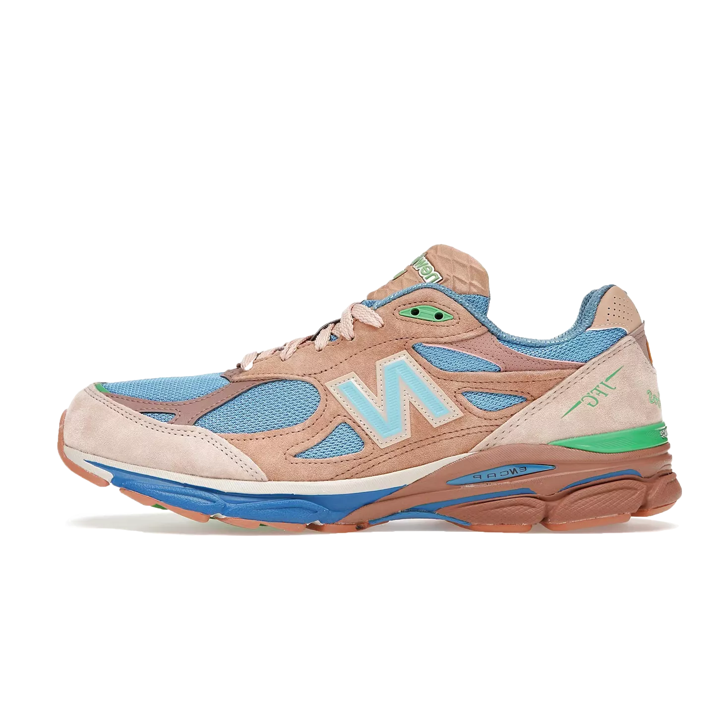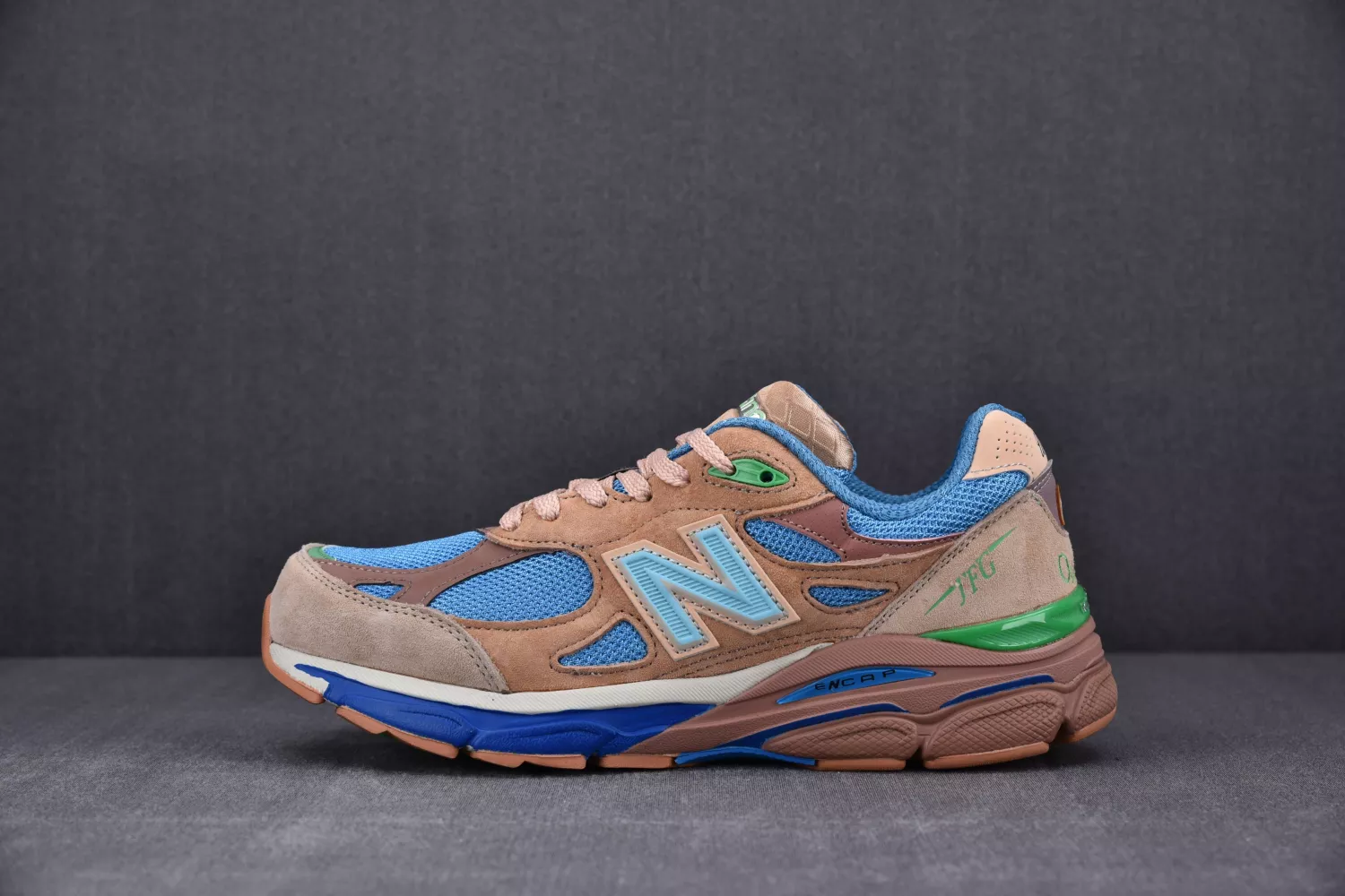 The New Balance 990v3 Joe Freshgoods Outside Clothes features a light blue mesh upper with tonal brown suede overlays and a blue New Balance logo. From there, green hardware, “JFG” text on the heel, and a multicolor ENCAP sole completes the design.