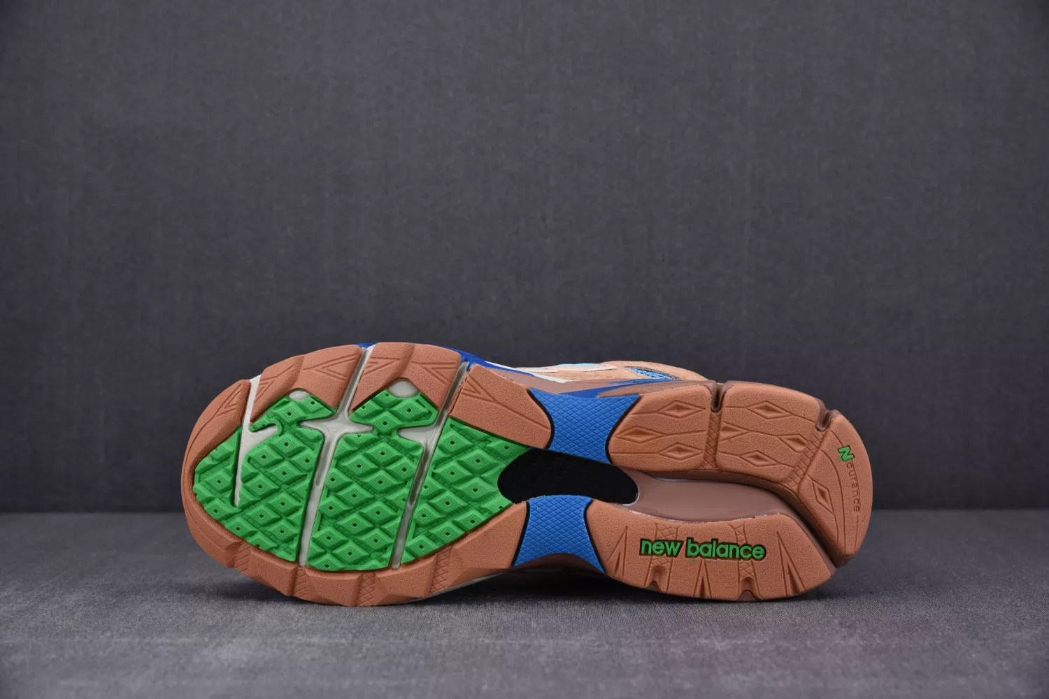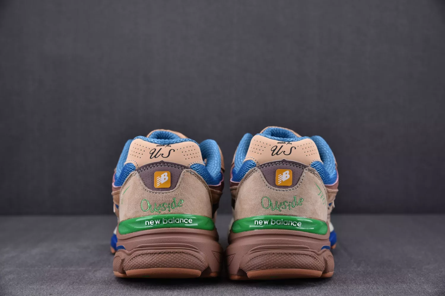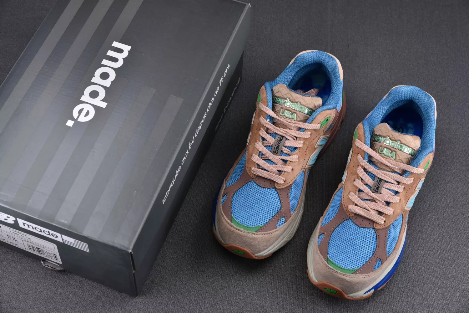 The New Balance 990v3 Joe Freshgoods Outside Clothes features a light blue mesh upper with tonal brown suede overlays and a blue New Balance logo. From there, green hardware, “JFG” text on the heel, and a multicolor ENCAP sole completes the design.