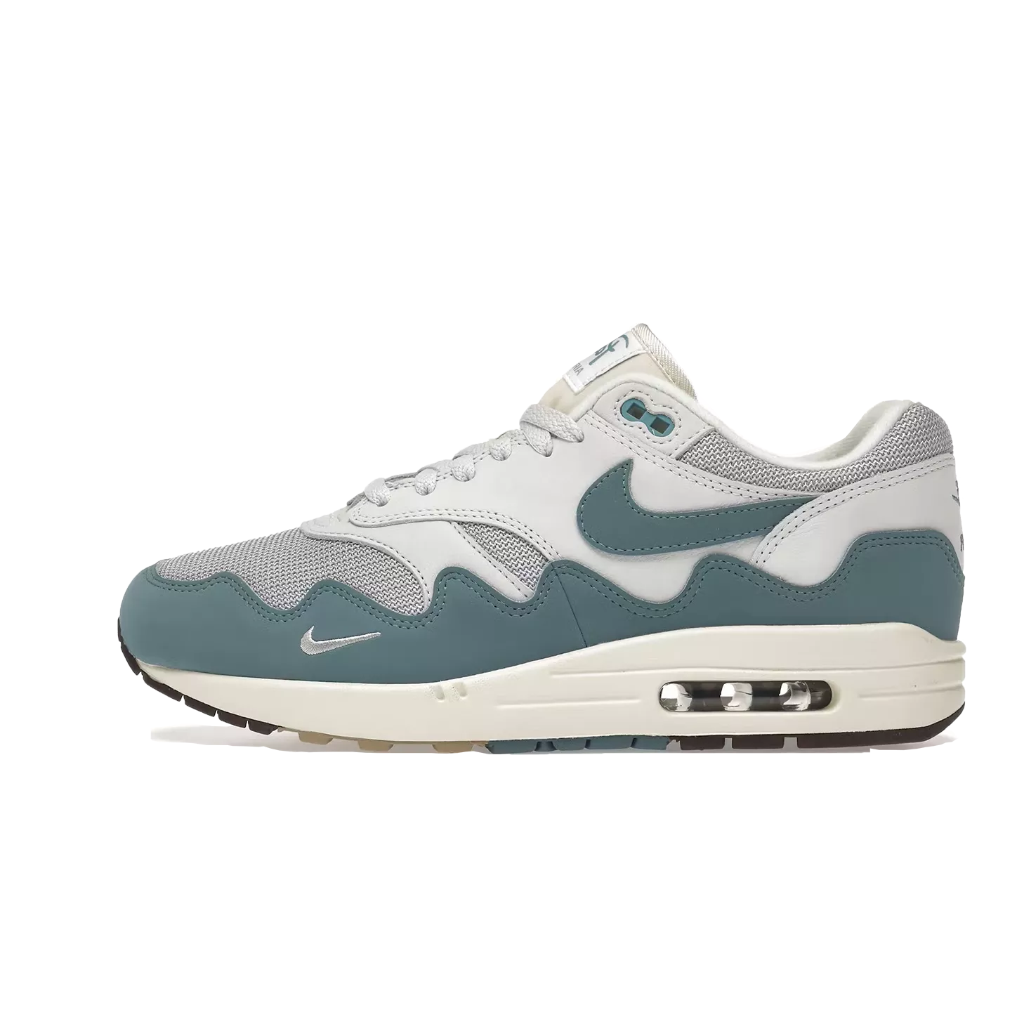 The Nike Air Max 1 Waves Patta Noise Aqua arrives in leather and mesh construction with an Aqua wave-shaped mudguard. Mini Swoosh embroidered detailing atop the mudguard and a co-branded woven tongue label provide a custom feel.