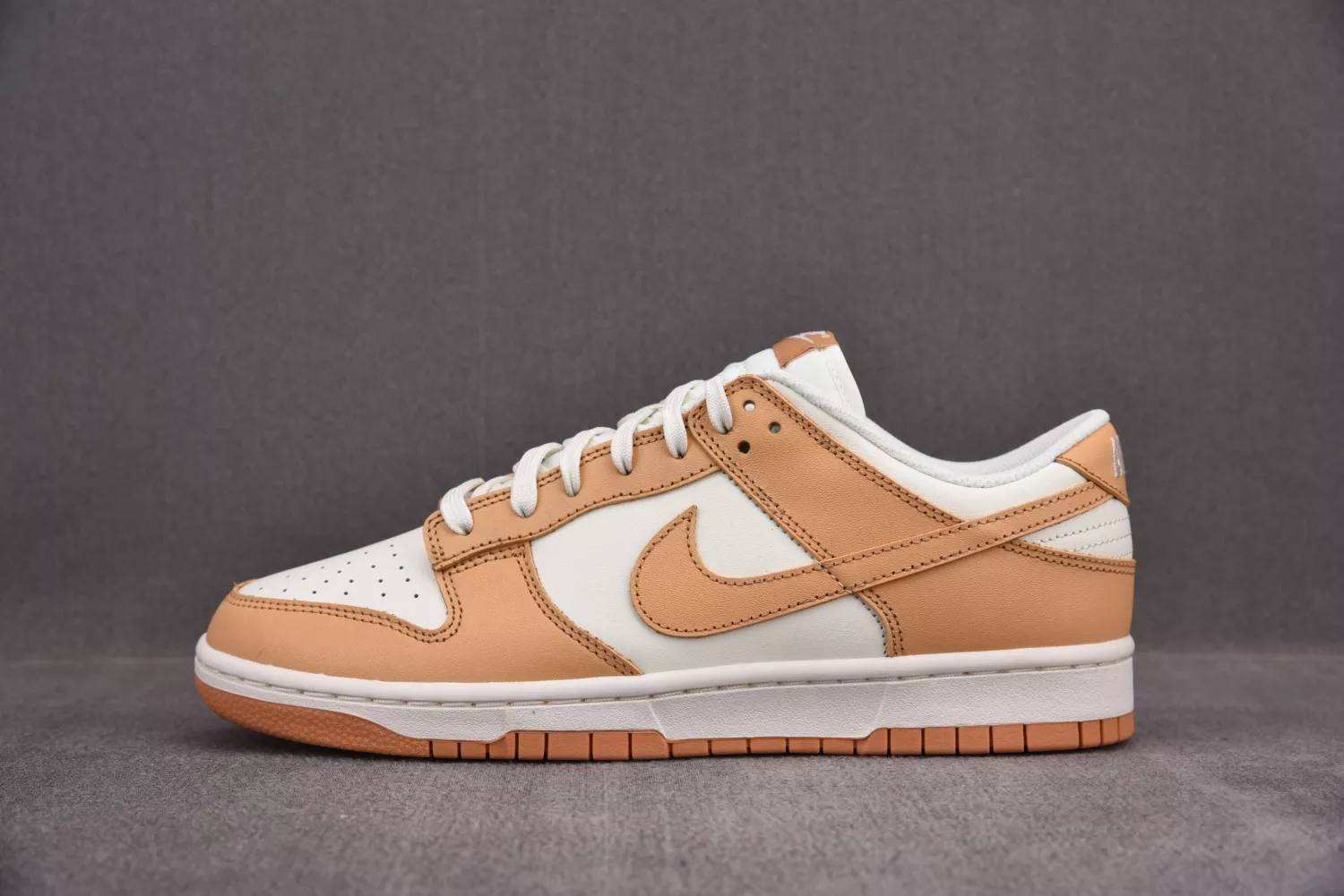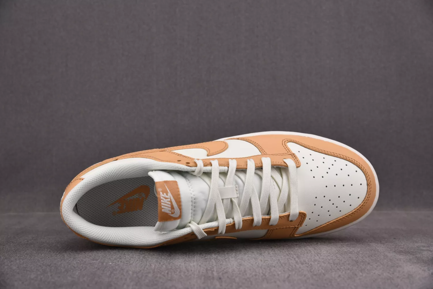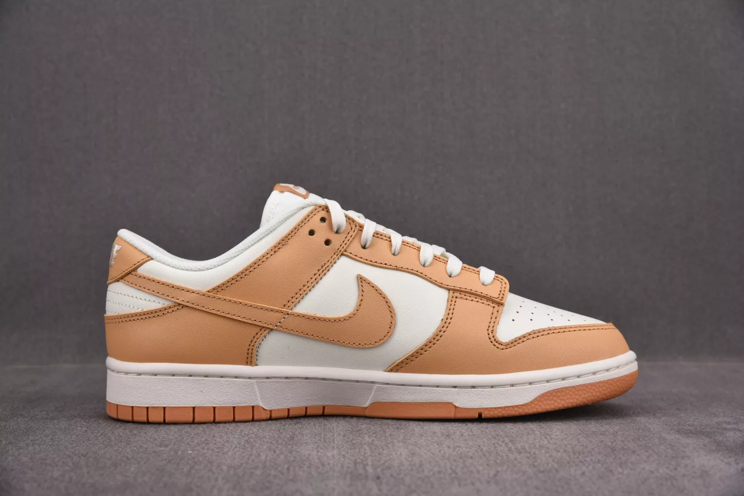 The women’s Nike Dunk Low Harvest Moon (W) features a white leather upper with light brown overlays and Swooshes. From there, a matching woven tongue label and sole complete the design.