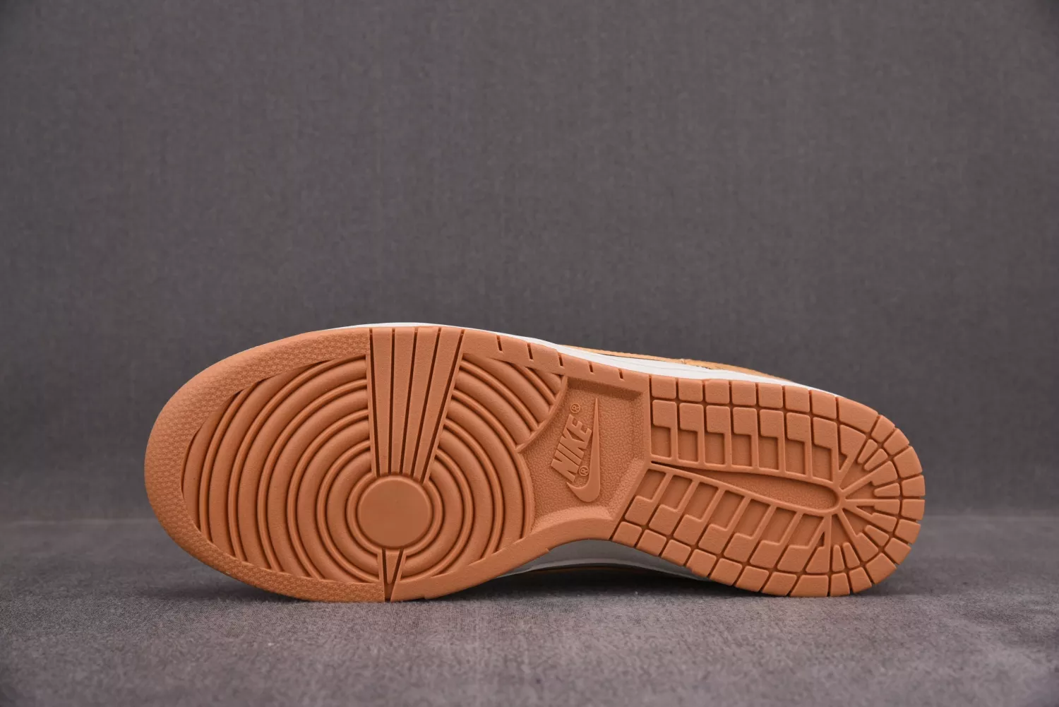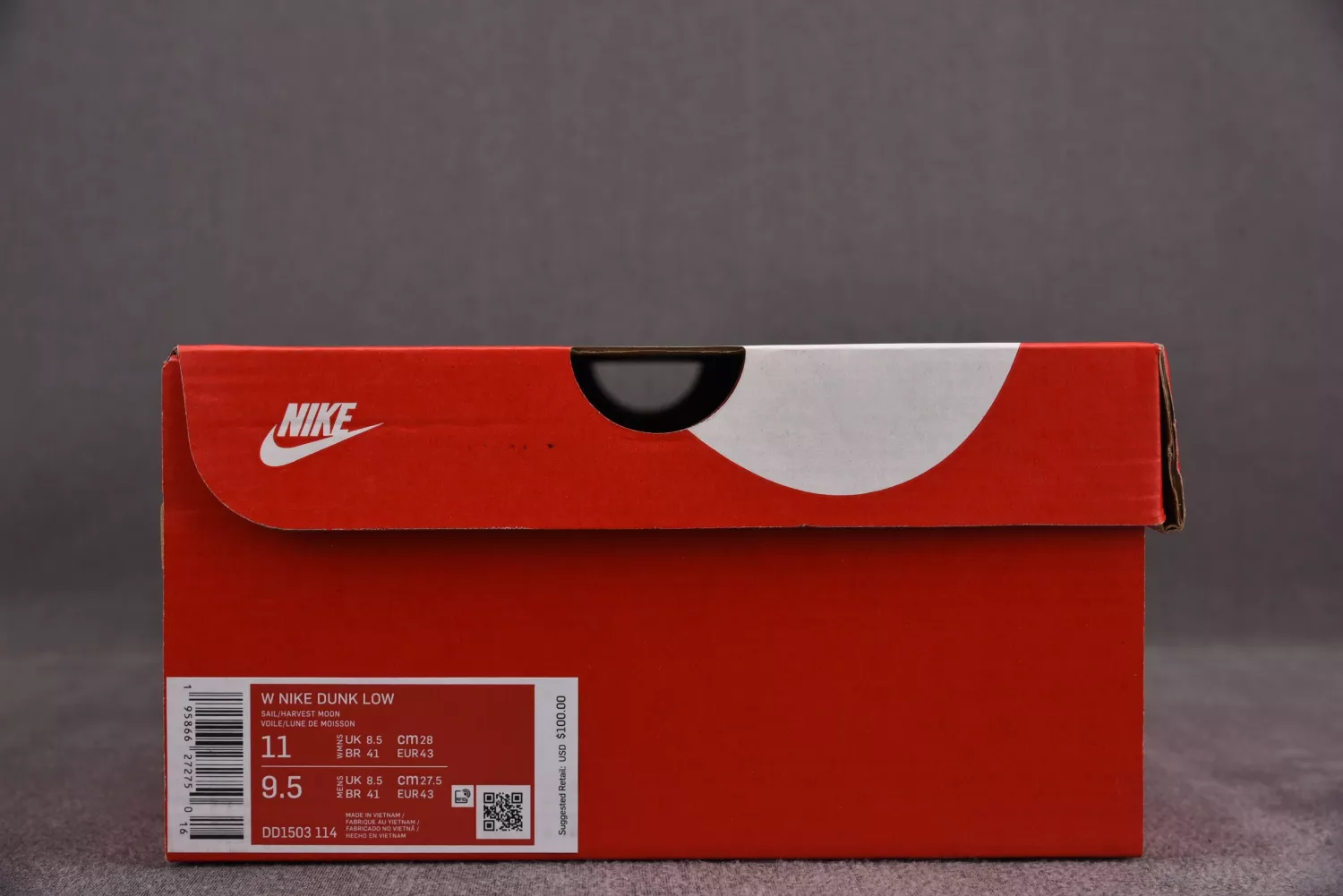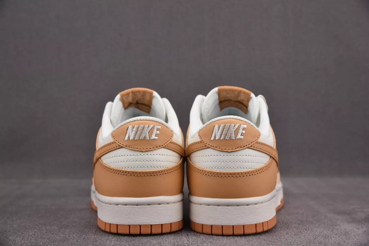 The women’s Nike Dunk Low Harvest Moon (W) features a white leather upper with light brown overlays and Swooshes. From there, a matching woven tongue label and sole complete the design.