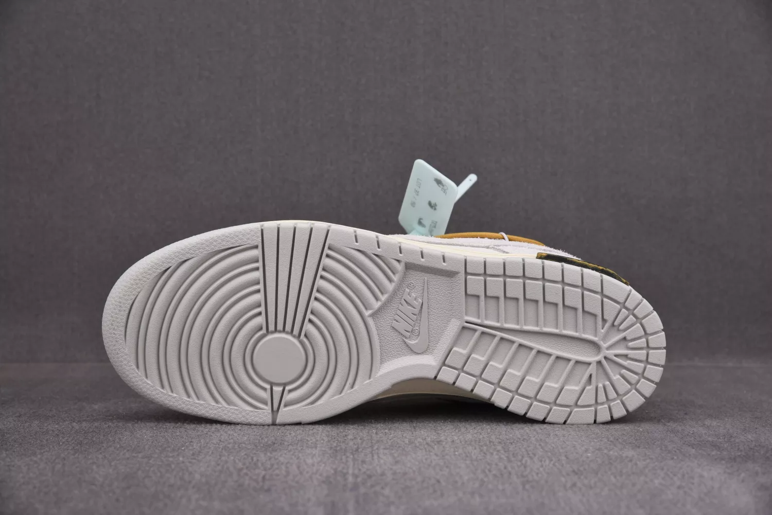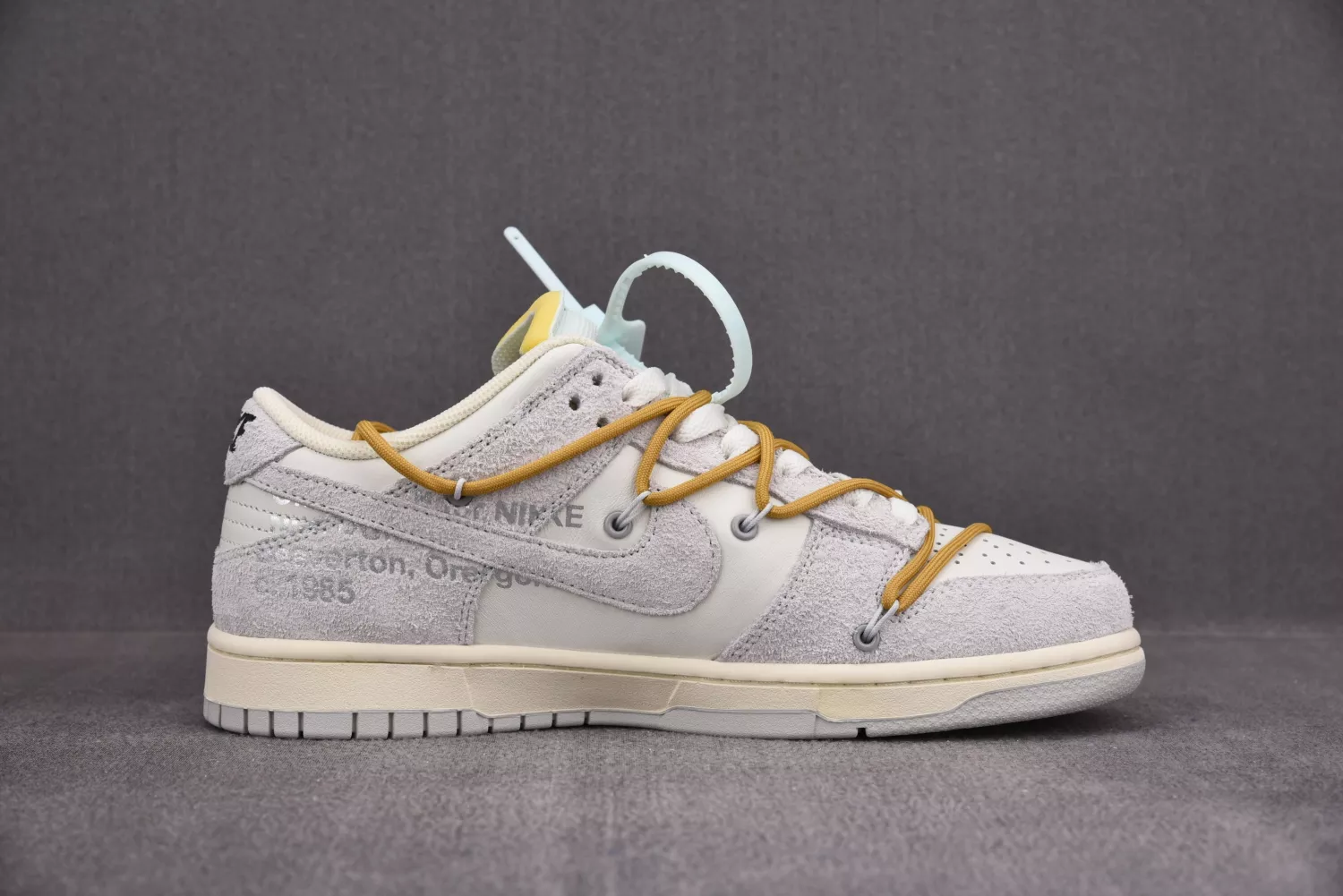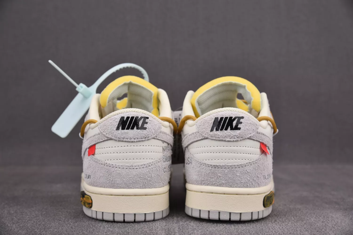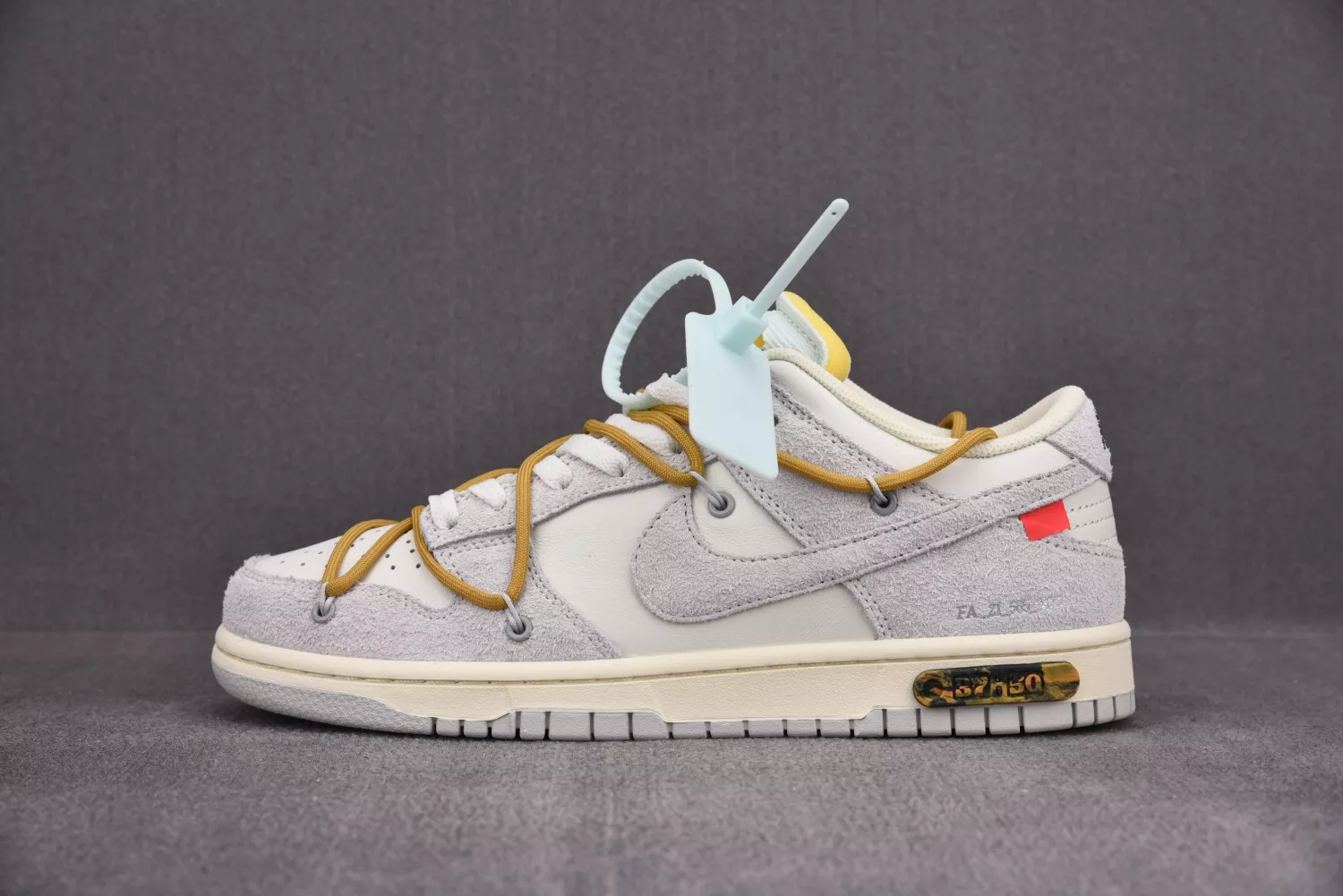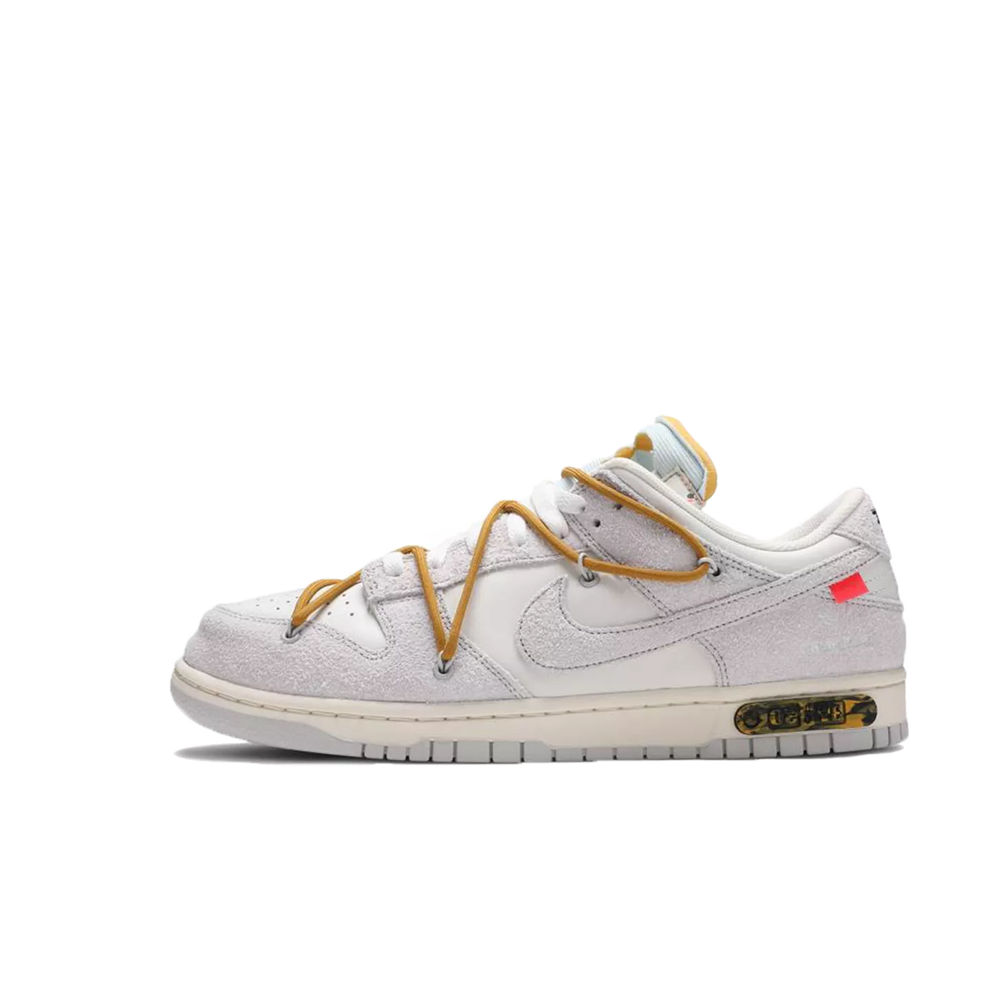 This Off-White x Nike Dunk Low is taken from the ‘Dear Summer’ collection, a sprawling follow-up to Virgil Abloh’s first Nike Dunk collaboration from 2019. The low-top makes use of a white leather upper with soft grey suede overlays, along with Virgil Abloh’s calling-card flourishes, which include a plastic zip tie and printed Helvetica text. Contrasting pops of color arrive via the sneaker’s secondary lacing system, zip-tie, an exposed-foam tongue and a rectangular tab affixed to the Swoosh. Limited to fifty pairs, a ’37 of 50’ badge is affixed on the lateral midsole.