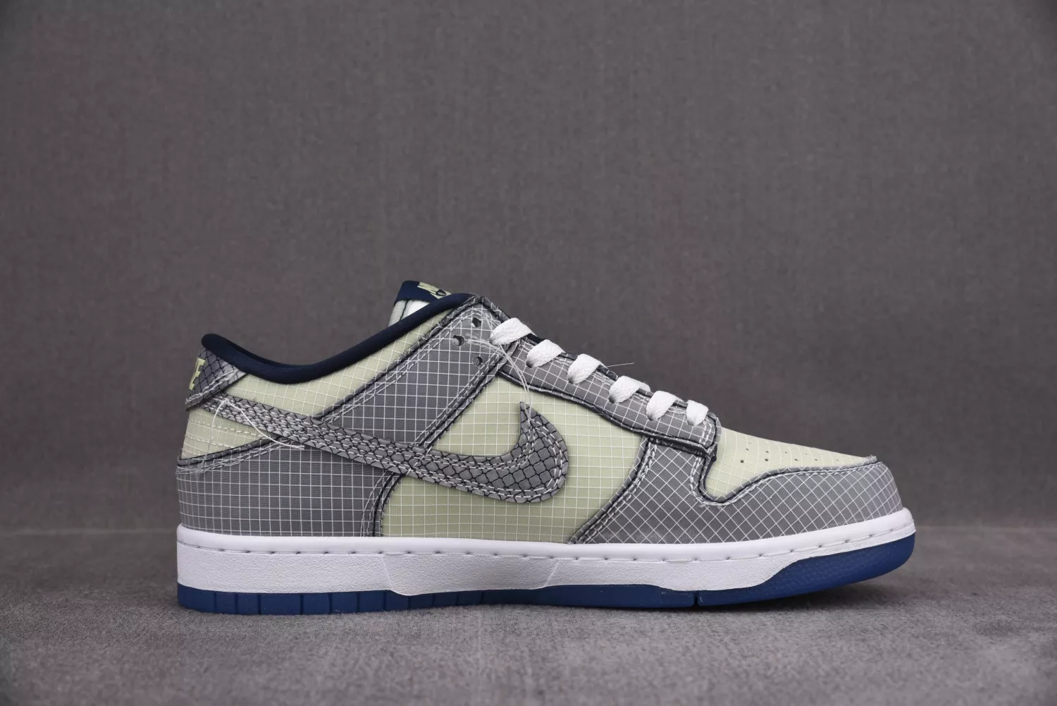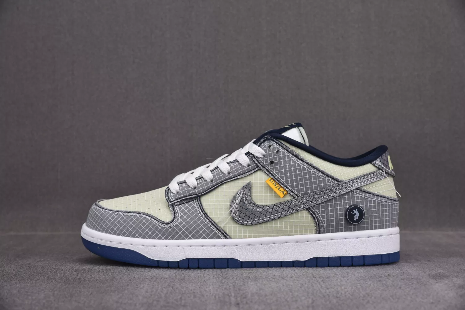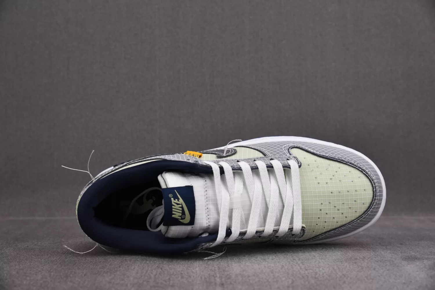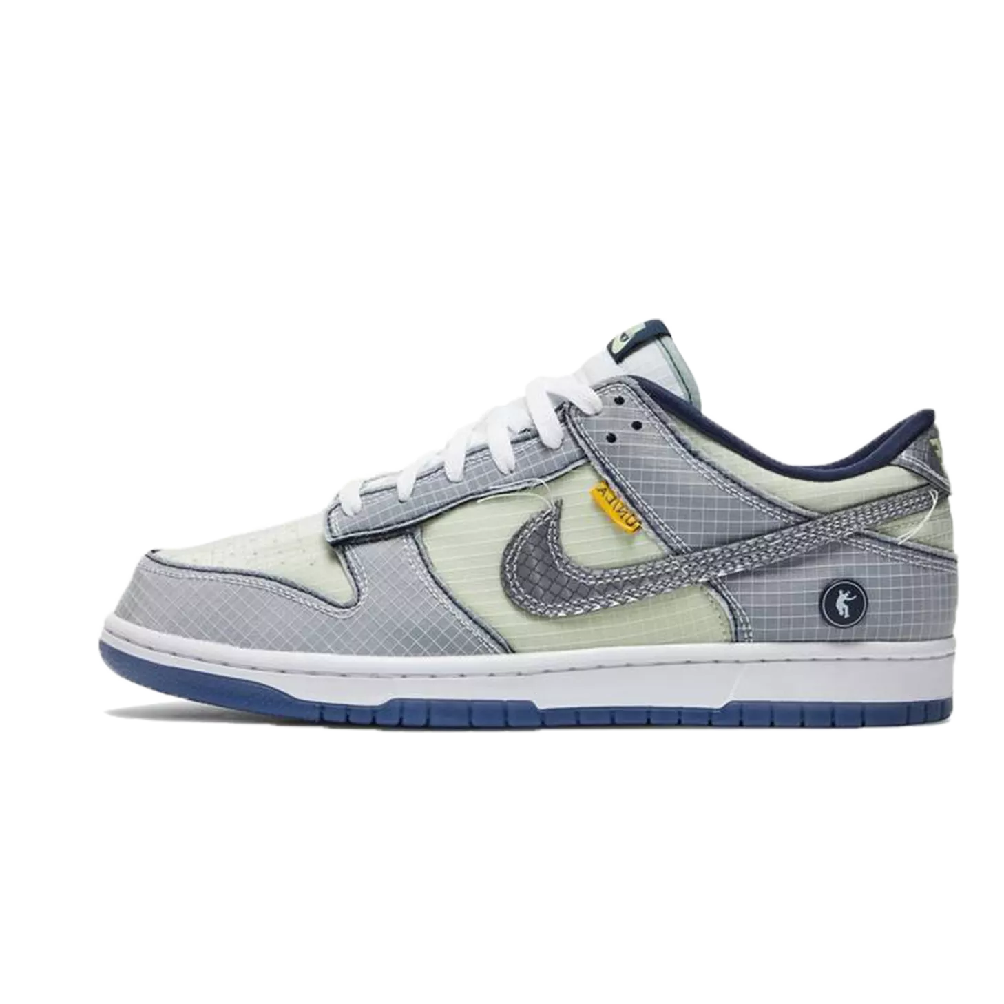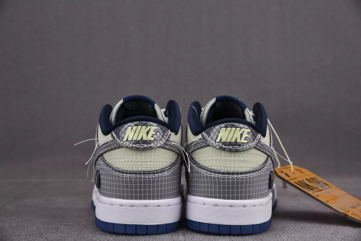 Union LA and Nike are gearing up for a two-part release of Nike Dunk Lows. The first images teased were of the blue colorway, and now we’ve received images of the “Midnight Navy” iteration. Uppers are dressed in grid-like mesh materials with soft green hues across the base, white on the tongue section, and steel grey on the overlays. Swooshes and rear heel tabs are given a reflective finish, and UN/LA garment tags line the mid-foot laterals. White contrast stitching is applied with uncut ends to give off a deconstructed look while navy hues are spread across the inner lining and the circular Frontman logo embellished on the heel counter. Below, a crisp white rubber midsole and semi-translucent navy outsole complete the look. Navy auxiliary laces are provided as an alternative to the standard white laces. Union opted for a flight-inspired presentation, with boarding pass motifs displayed across the shoebox, passport stamps on the Frontman monogram wrapping paper, and a large co-branded baggage tag attached to the pairs. The story behind the upcoming collaboration has yet to be revealed.