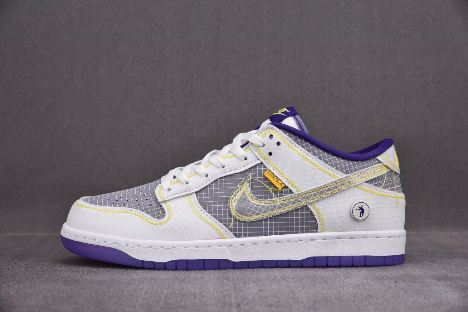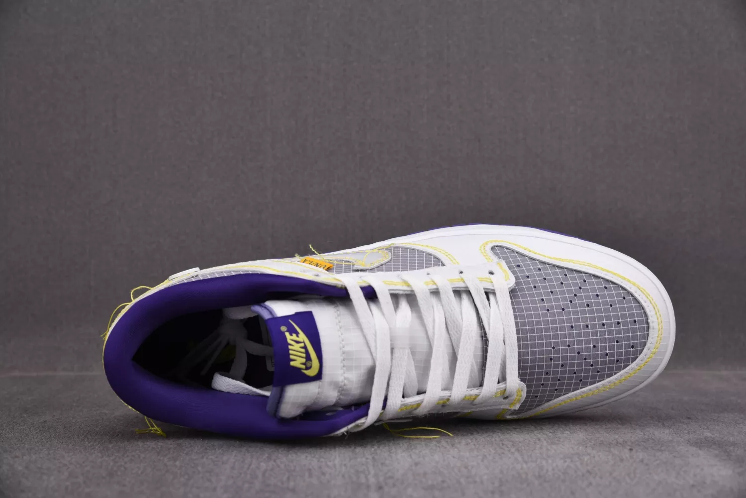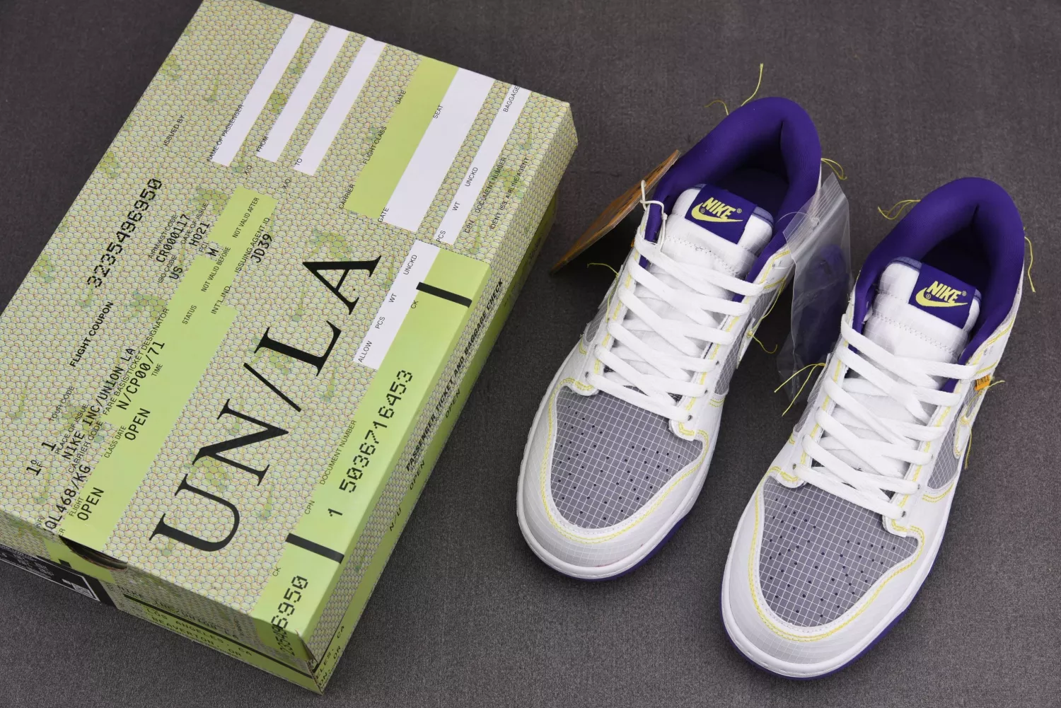 After having such an impressive year of collaborations in honor of its 30th anniversary in 2021, Union LA is even more ready to take the world by storm in 2022 with more compelling partnerships. On the footwear front, the notable streetwear boutique is confirmed to be linking up with Nike and Jordan Brand for several offerings, one being this Union x Nike Dunk Low “Purple/Gold” colorway. Thematically, these forthcoming kicks appear to tap into the world of flight, that’s exhibited through the various materials and embellishments that are found throughout the upper. Ridding of the traditional leather fabrics that are used on this model, Union wraps the entire base with synthetic grid patterns, the overlays of which are supplied with white finishes while the toe boxes, quarters and collars are dialed to a darker purple. Vivid yellow hits are present across the exposed stitchings that outline the upper panels, Swooshes and heel branding, and radiate somewhat of a Lakers-friendly aesthetic. Branding from the LA-based retailers is found via yellow “UN/LA” tabs which are attached to the quarters and its signature Frontman logo that is fastened to the lateral heels.