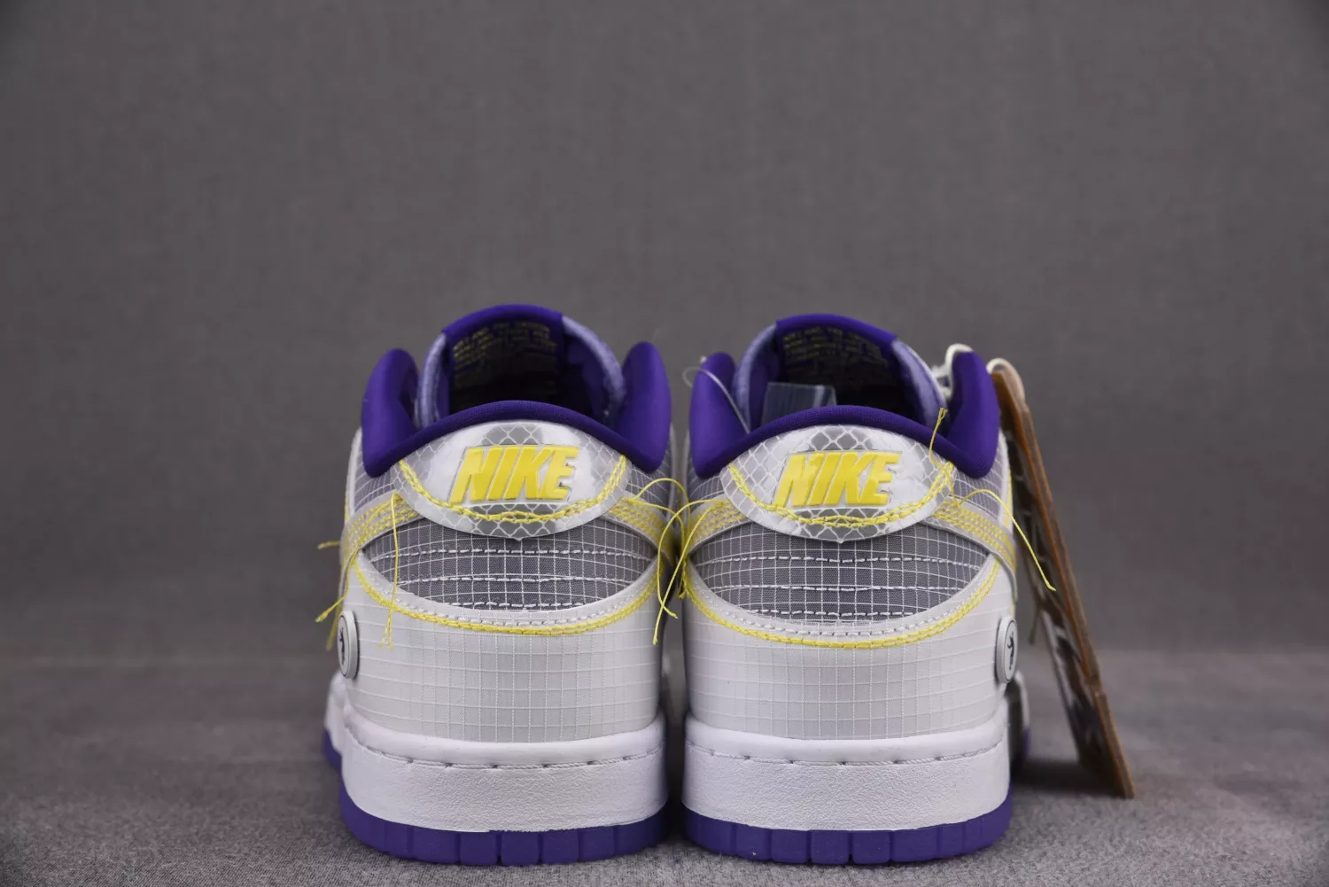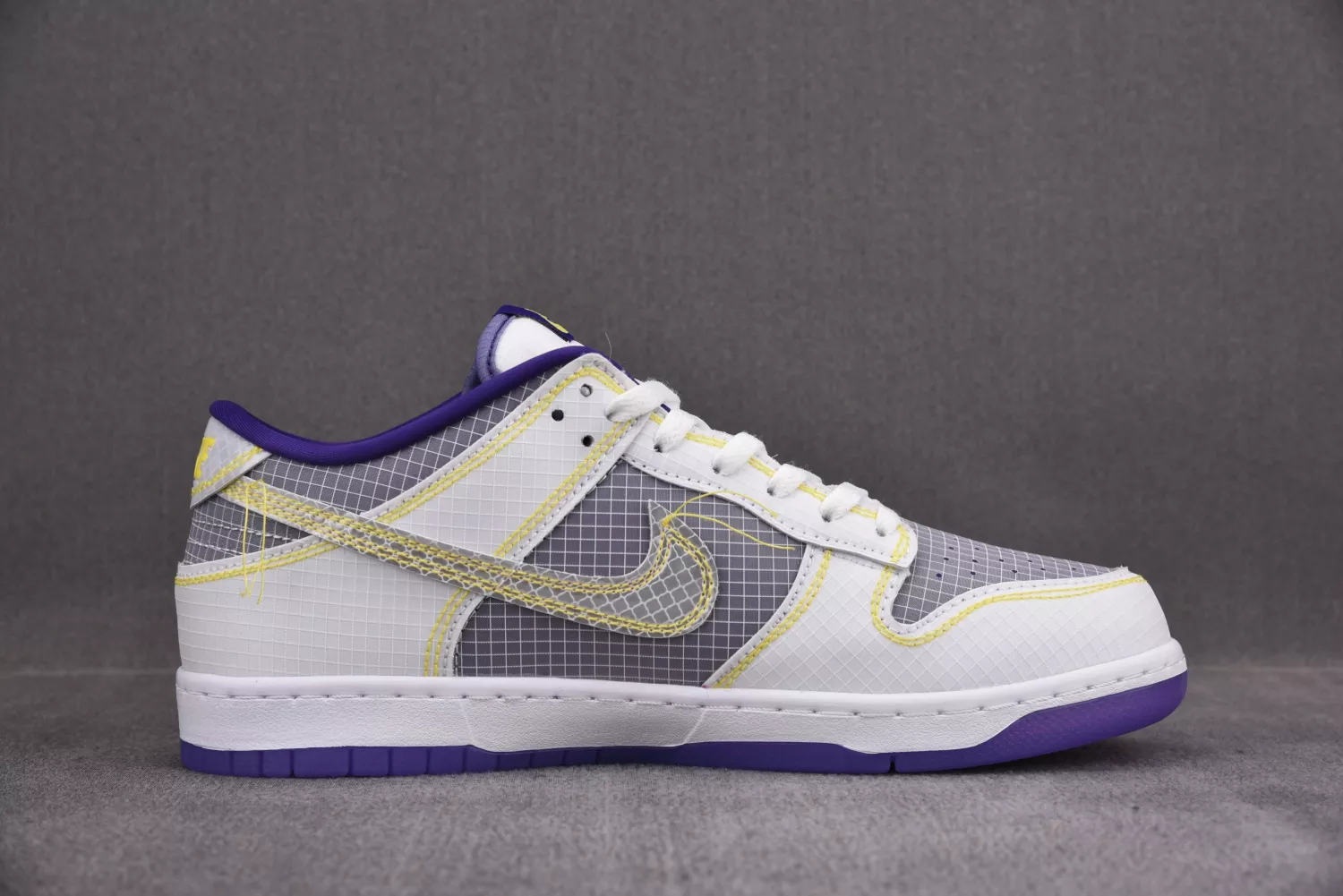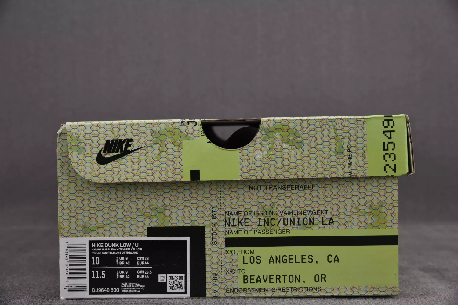 After having such an impressive year of collaborations in honor of its 30th anniversary in 2021, Union LA is even more ready to take the world by storm in 2022 with more compelling partnerships. On the footwear front, the notable streetwear boutique is confirmed to be linking up with Nike and Jordan Brand for several offerings, one being this Union x Nike Dunk Low “Purple/Gold” colorway. Thematically, these forthcoming kicks appear to tap into the world of flight, that’s exhibited through the various materials and embellishments that are found throughout the upper. Ridding of the traditional leather fabrics that are used on this model, Union wraps the entire base with synthetic grid patterns, the overlays of which are supplied with white finishes while the toe boxes, quarters and collars are dialed to a darker purple. Vivid yellow hits are present across the exposed stitchings that outline the upper panels, Swooshes and heel branding, and radiate somewhat of a Lakers-friendly aesthetic. Branding from the LA-based retailers is found via yellow “UN/LA” tabs which are attached to the quarters and its signature Frontman logo that is fastened to the lateral heels.