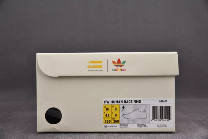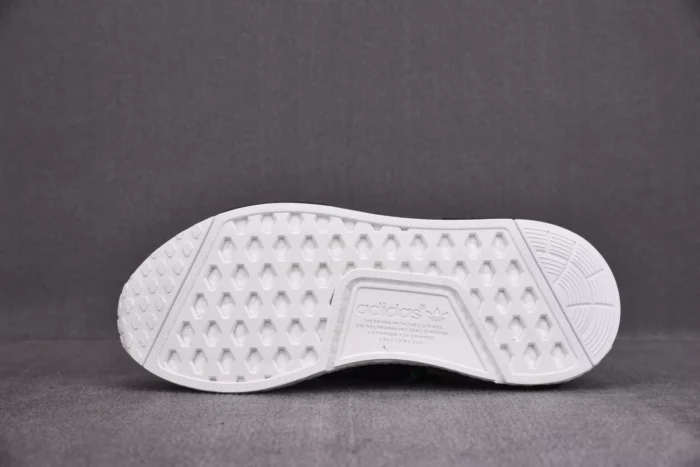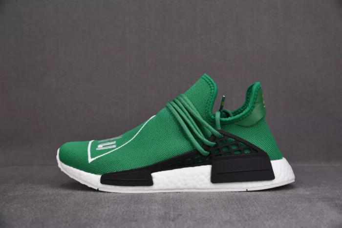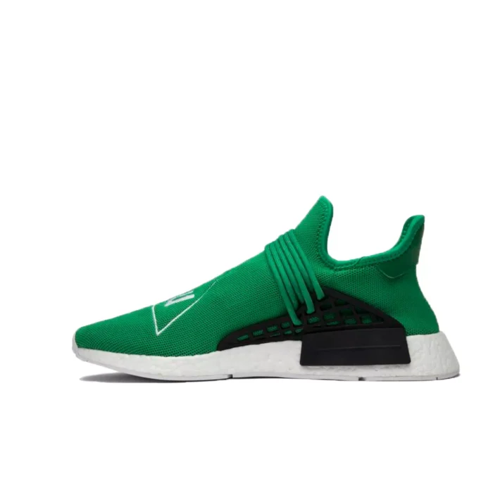 The Pharrell x NMD ‘Human Race’ ‘Green’ has green Primeknit uppers with white embroidered triangles featuring the words ‘HU’ on both feet. Released in September of 2016, the design also includes a black foot cage, white Boost midsoles, black bumpers, and a white outsole.